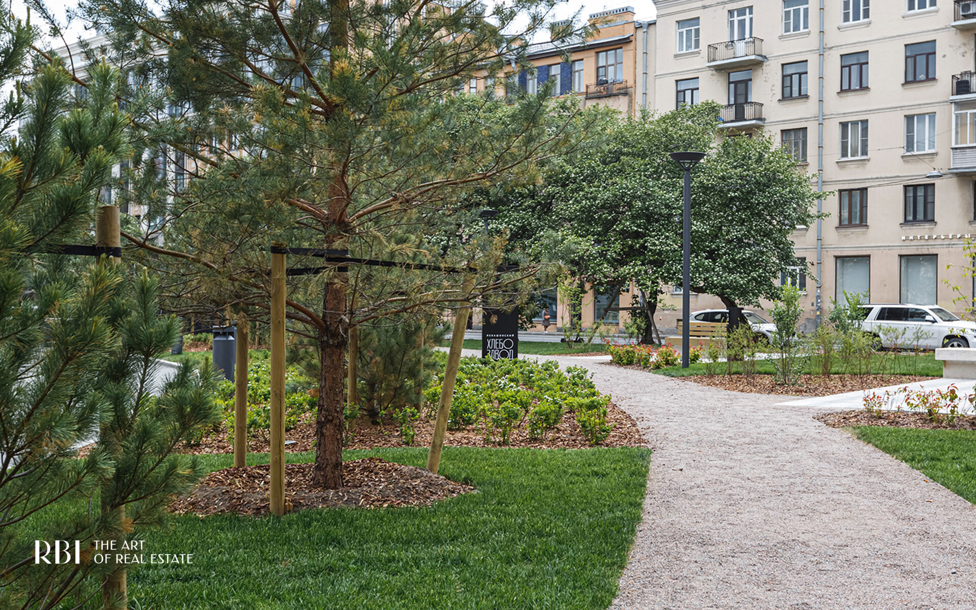 Вокруг бывшего хлебозавода разбили живописный сквер с деревьями-крупномерами, открытый для всех петербуржцев.
