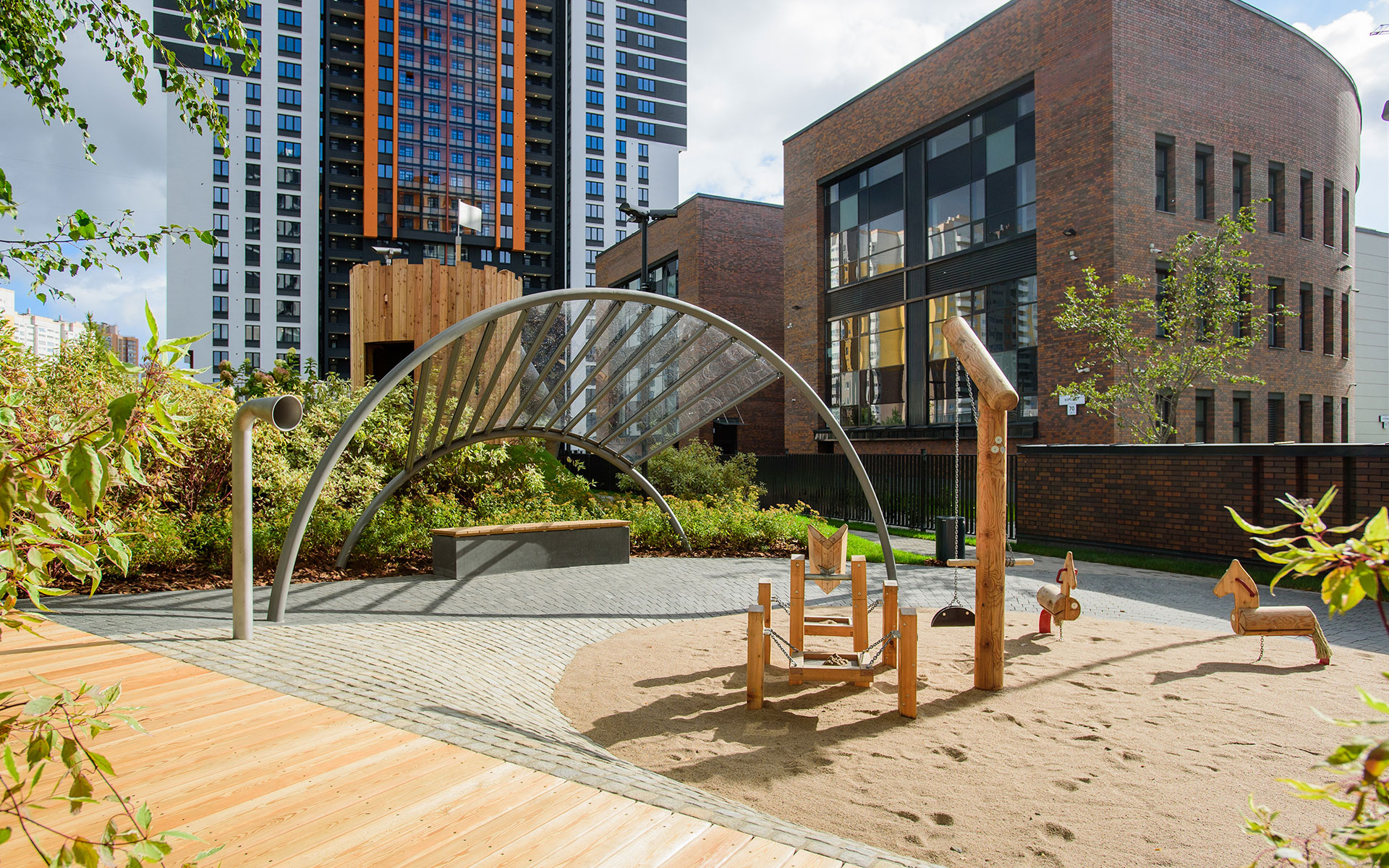 Вокруг бывшего хлебозавода разбили живописный сквер с деревьями-крупномерами, открытый для всех петербуржцев.