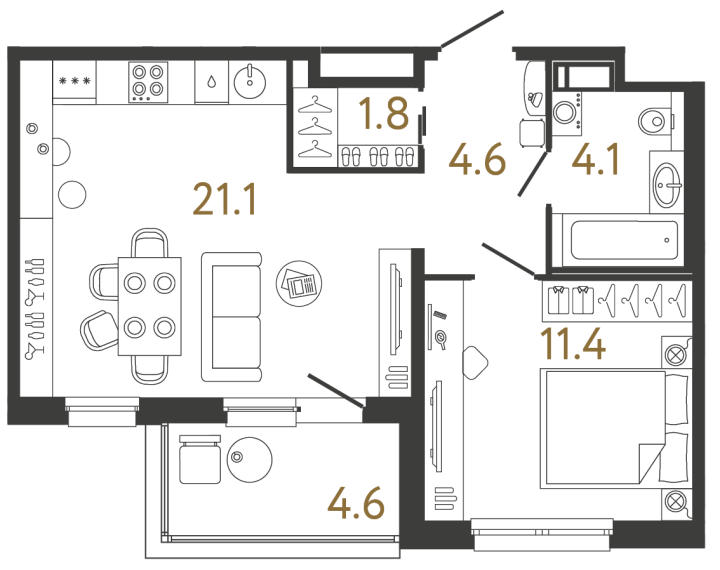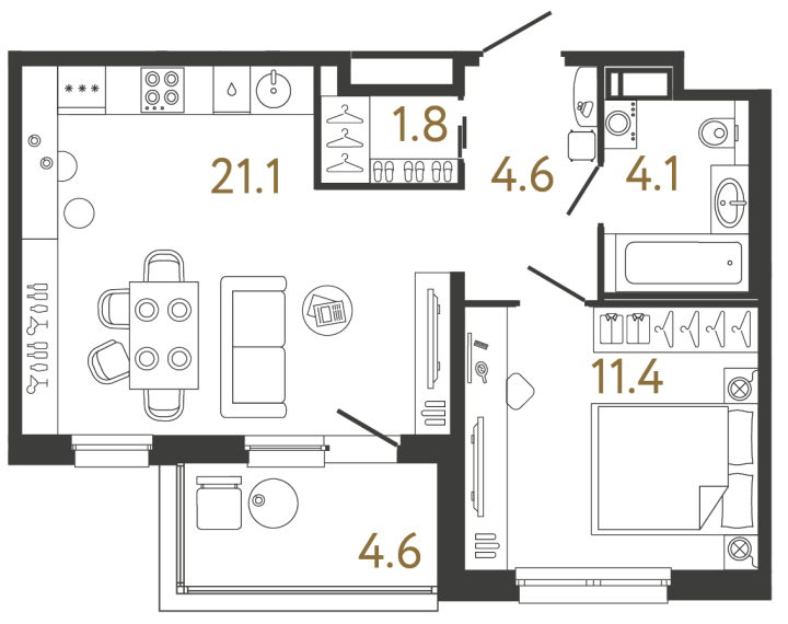 - 1-комнатные квартиры с большой кухней